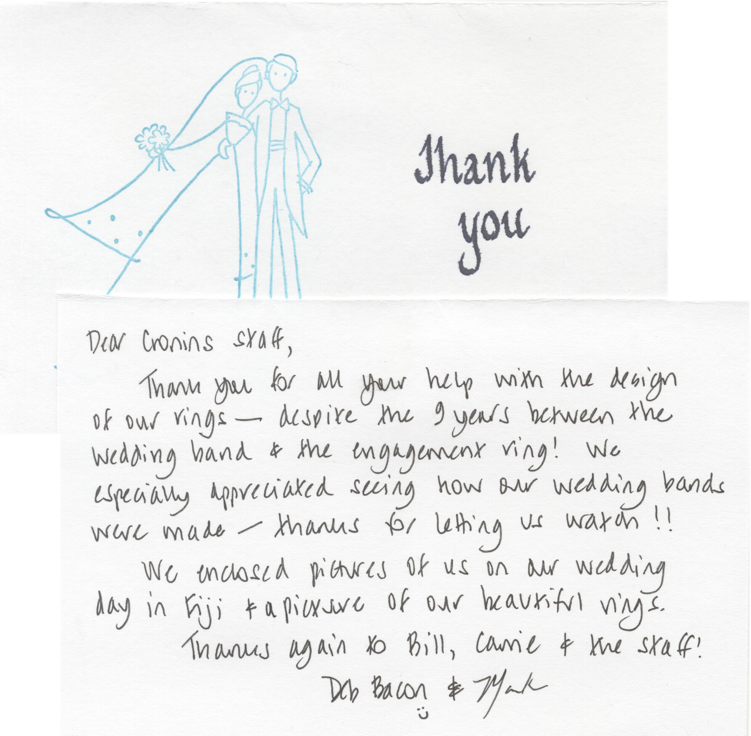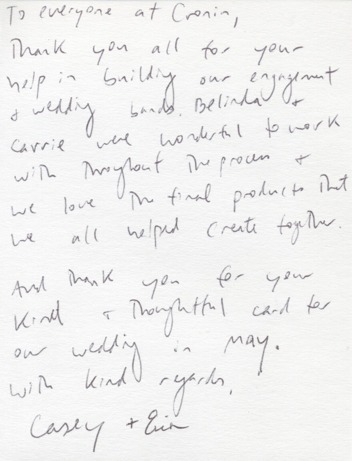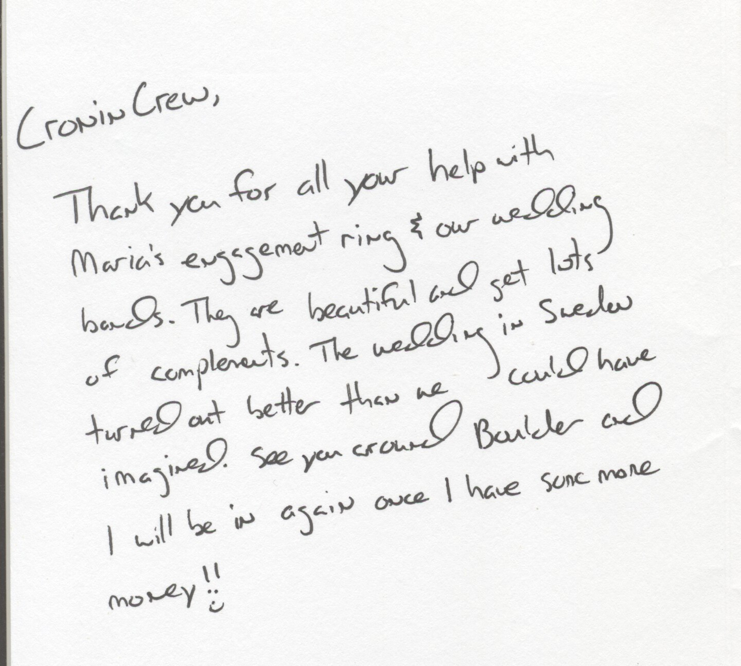 They also polish our rings free of charge whenever we stop by. I would highly recommend Cronin Jewelers to anyone!”