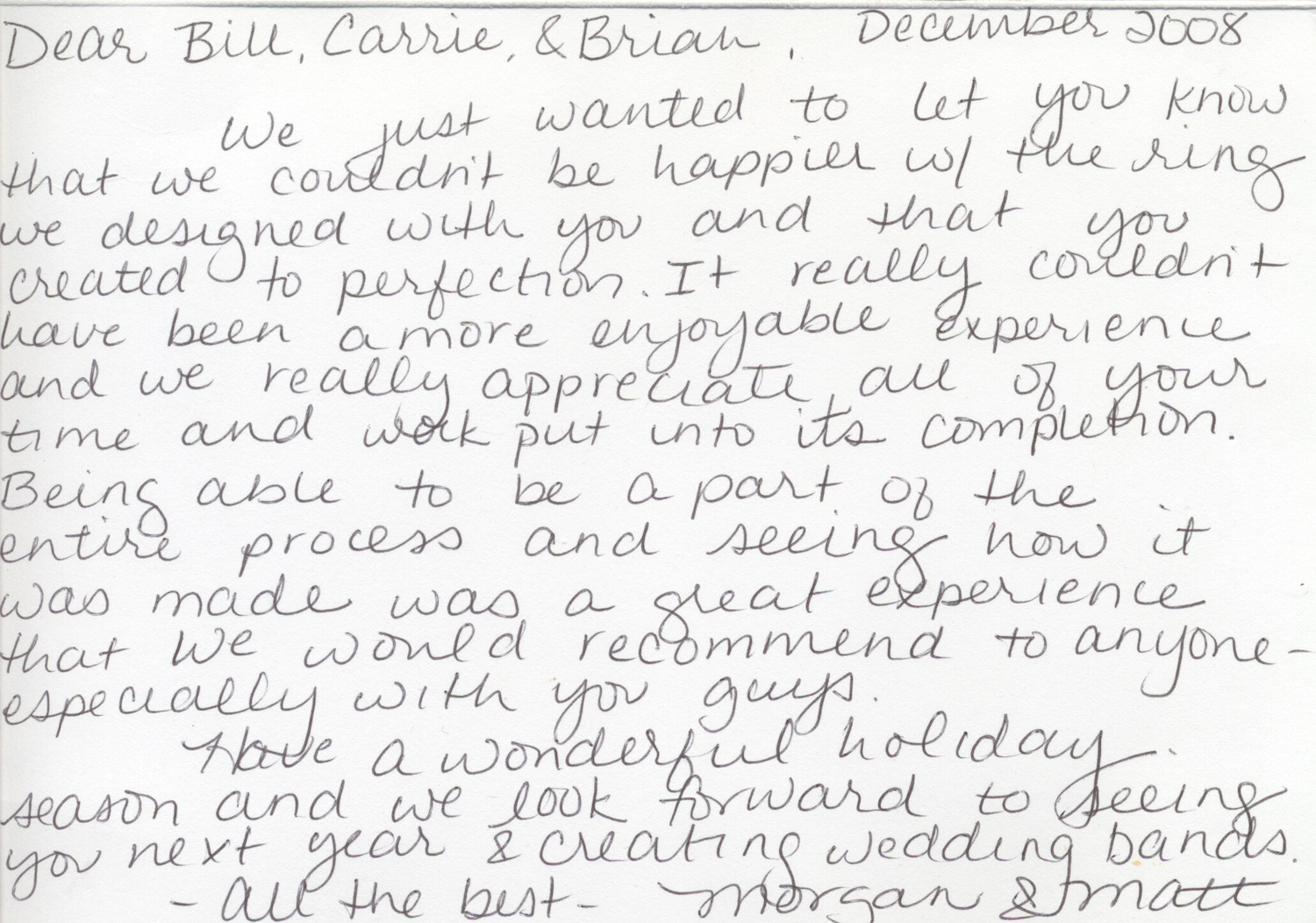 “We had them custom make my wedding band and my husband’s ring, and they were perfect. I can’t speak more highly of the quality or craftsmanship. Great service, and fun to be around too!”